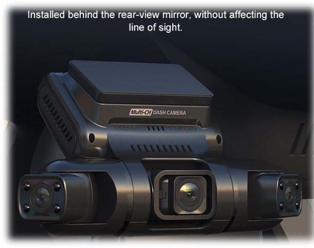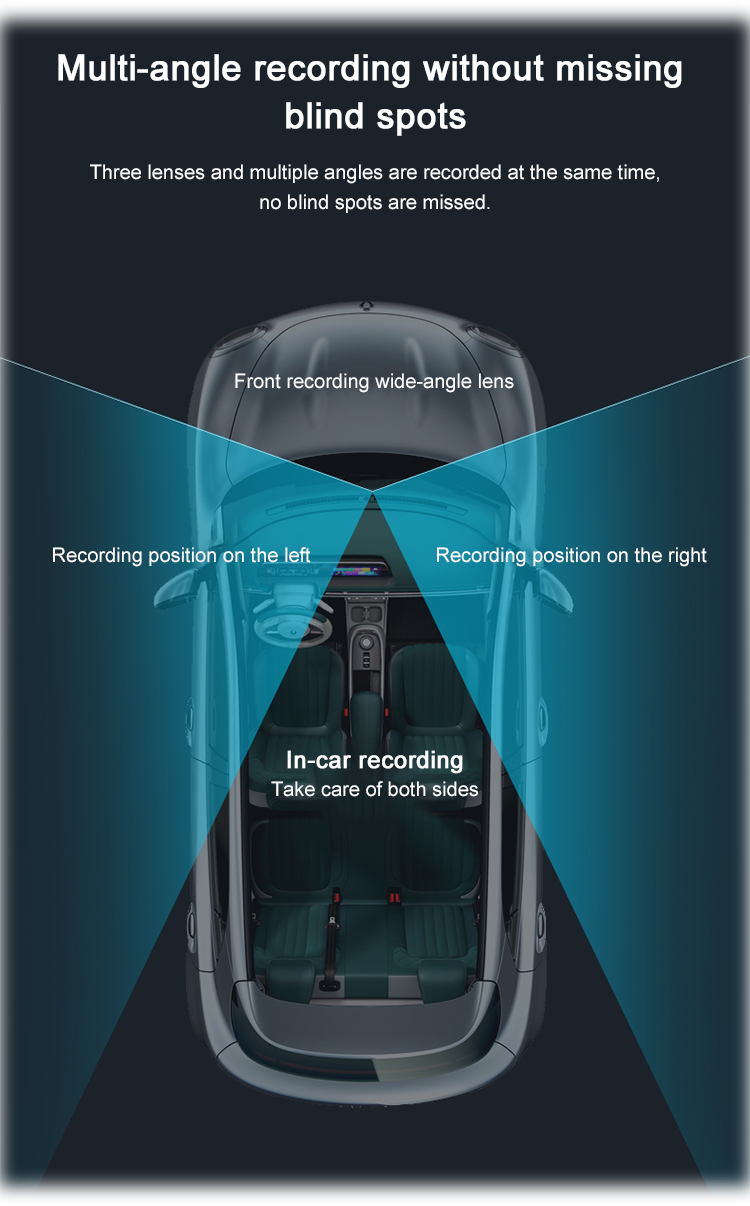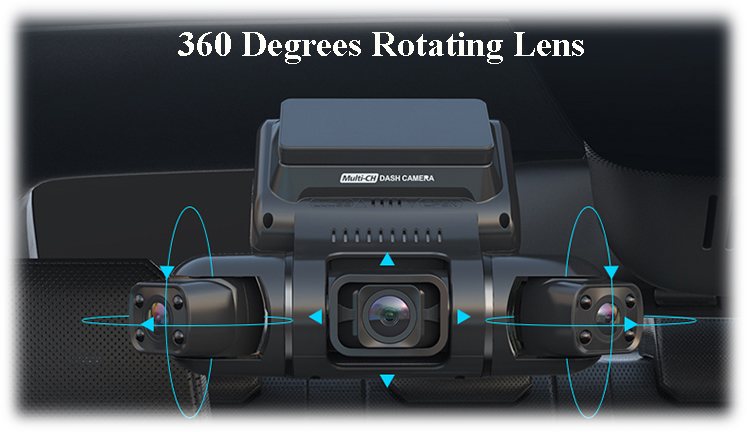 The front lens of the 360° Adjustable Rotating TRi (3) Lens Dash Camera can be adjusted up and moved from side to side. The right and left side camera lenses are adjustable and can be fully rotated, allowing for wide-angle recording that captures an entire image from inside/outside of the car at the same time. Thus, providing almost a full front view, side views, inside views, and rear views, eliminating most blind spots.